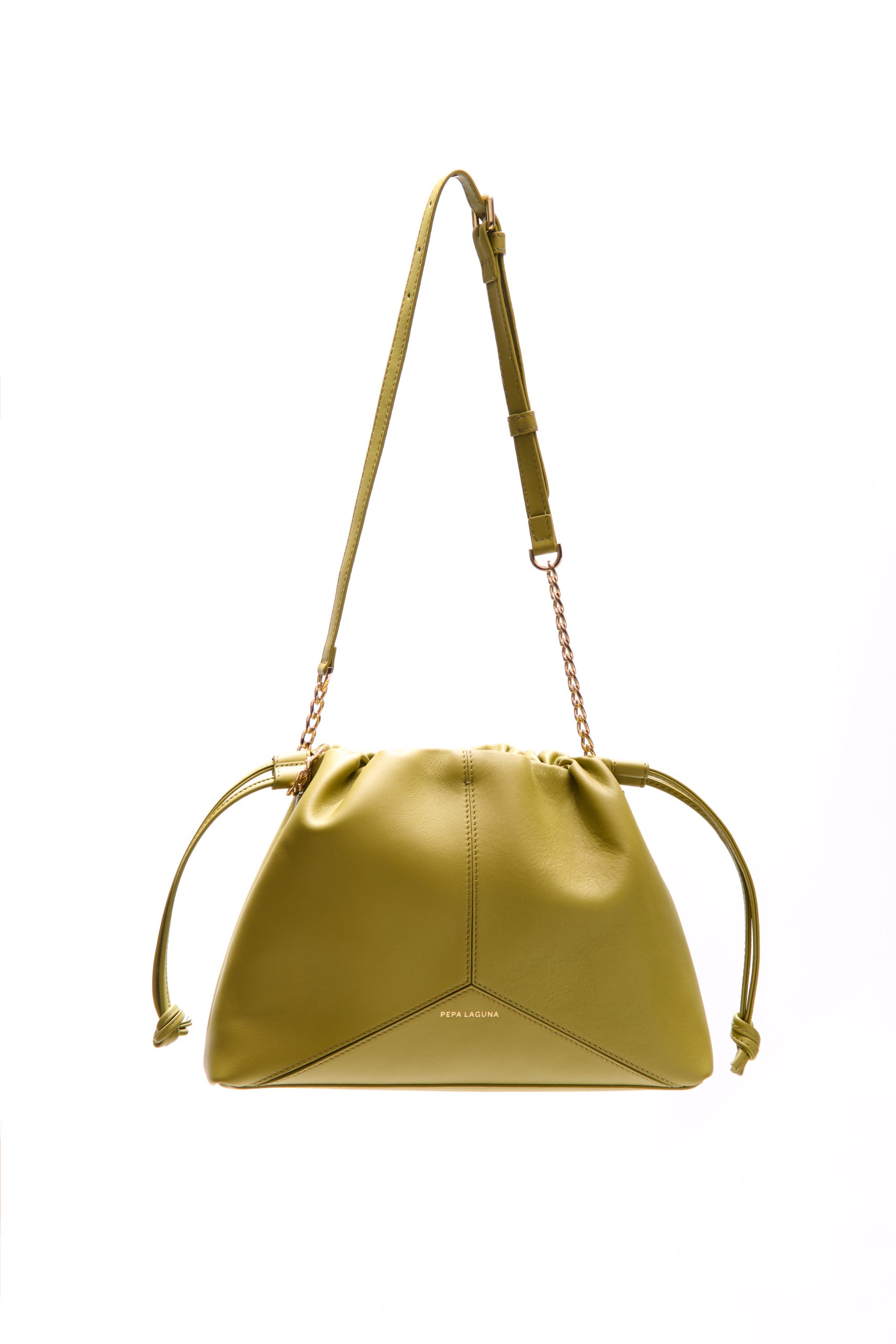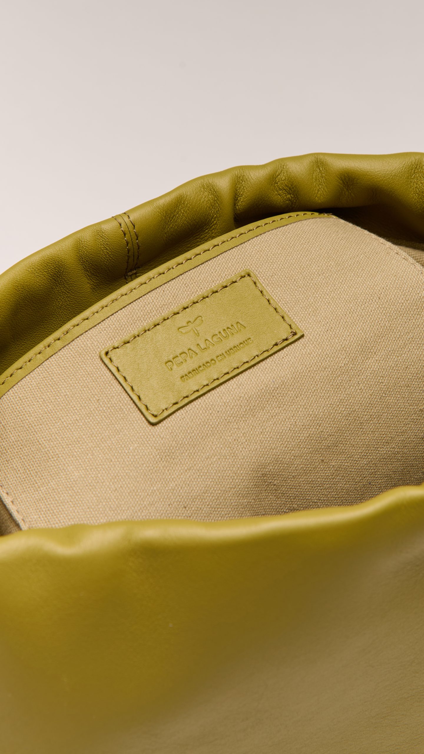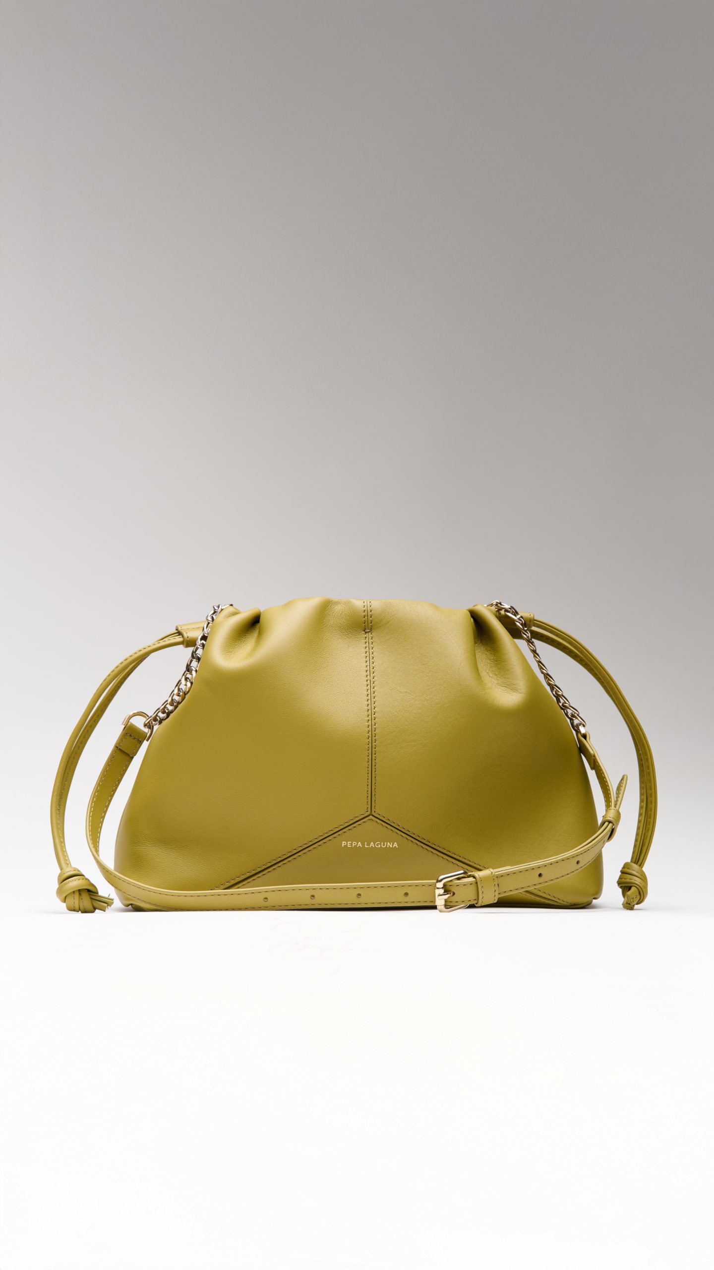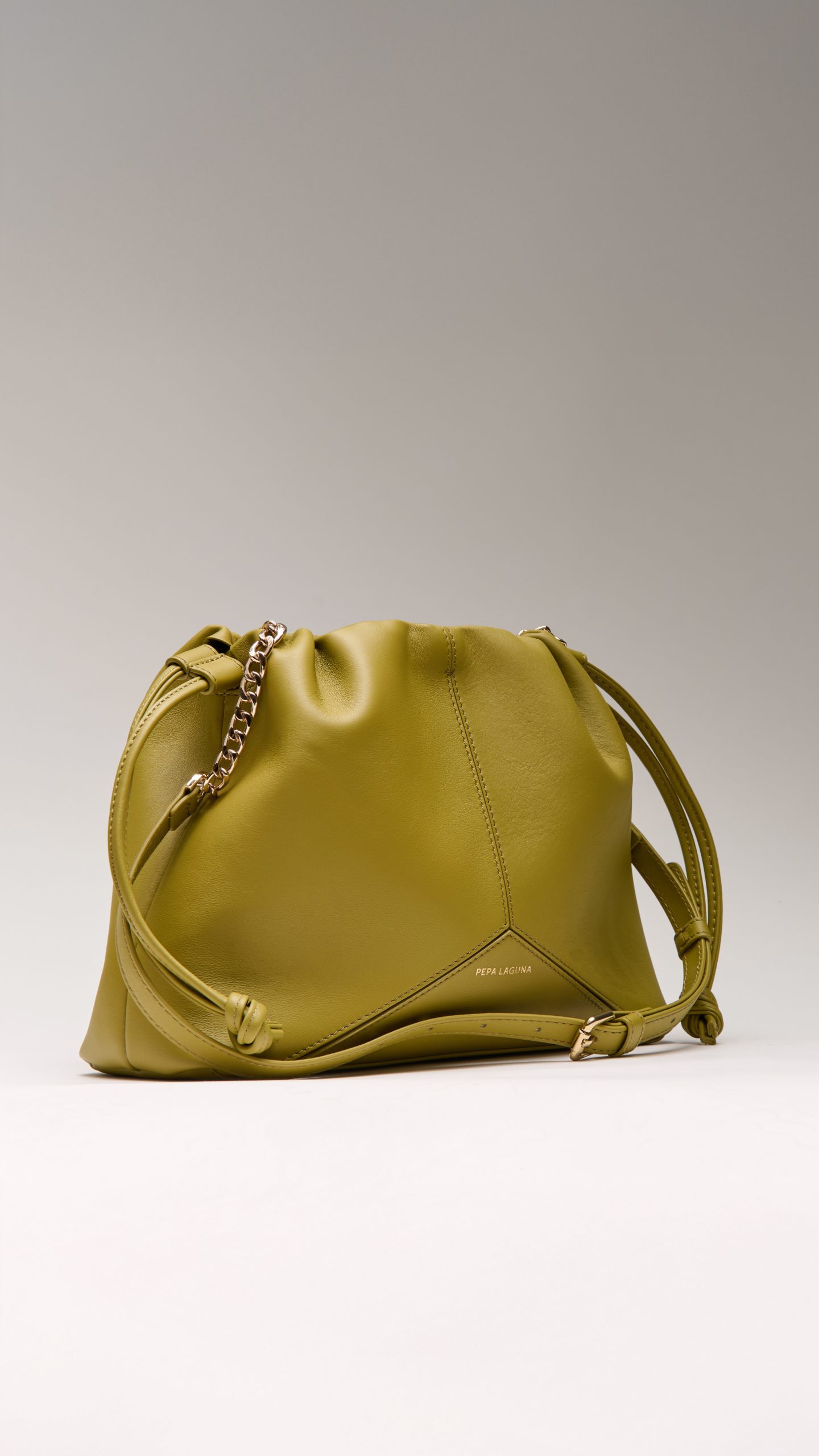 De color verde oliva, este modelo tipo saco presenta un diseño estructurado pero flexible, que se adapta cómodamente al cuerpo. Cuenta con un cierre de frunce con cordones en piel que acaban en nudos, una correa ajustable en piel, combinada con cadena metálica y un asa de mano en piel, aportando un equilibrio perfecto entre funcionalidad y estilo contemporáneo, haciendo ideal esta pieza tanto para el día a día como para ocasiones más especiales. El interior, forrado en algodón 100% en un elegante tono verde claro, incluye un práctico bolsillo plano que añade organización sin sacrificar amplitud.