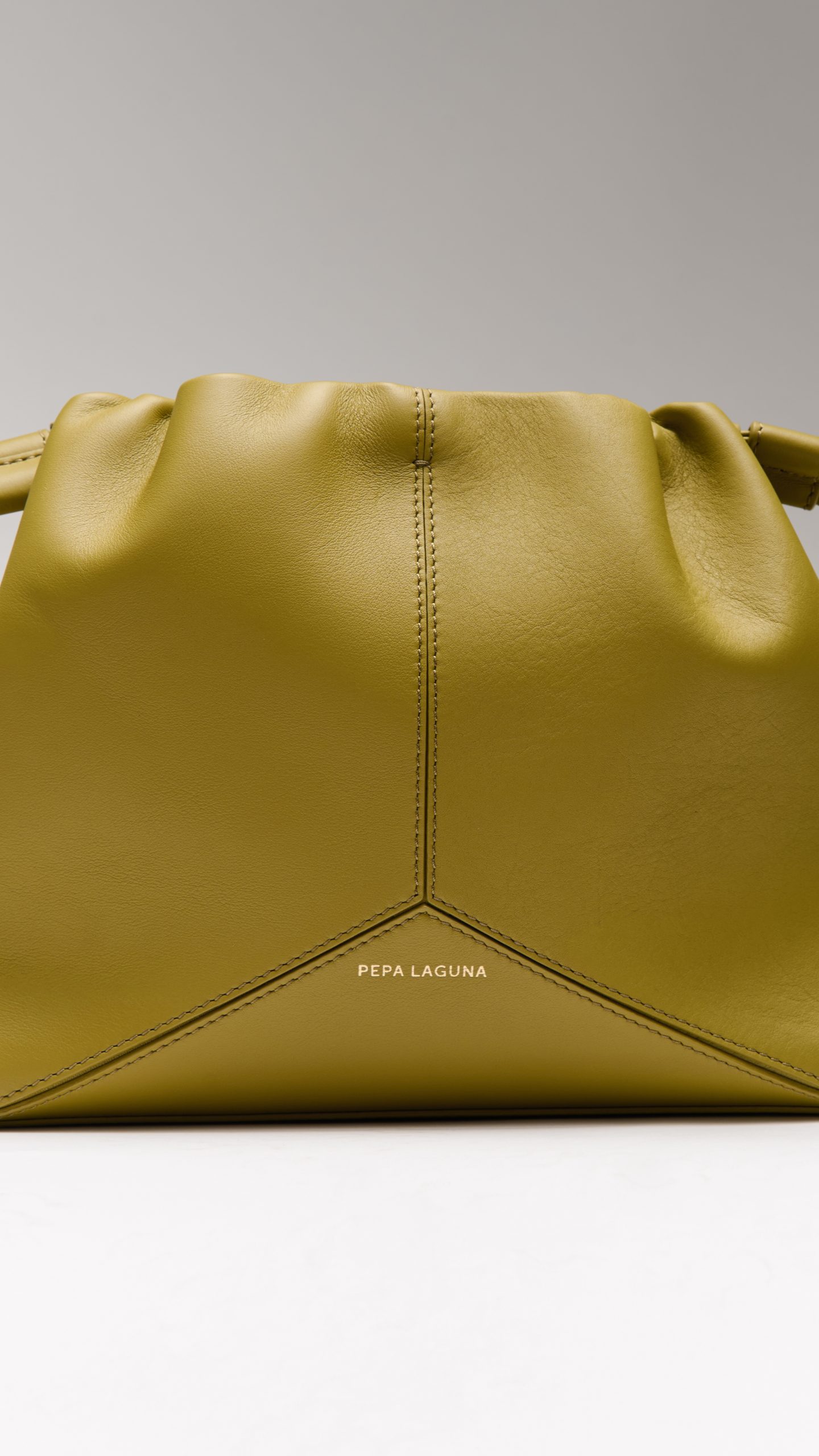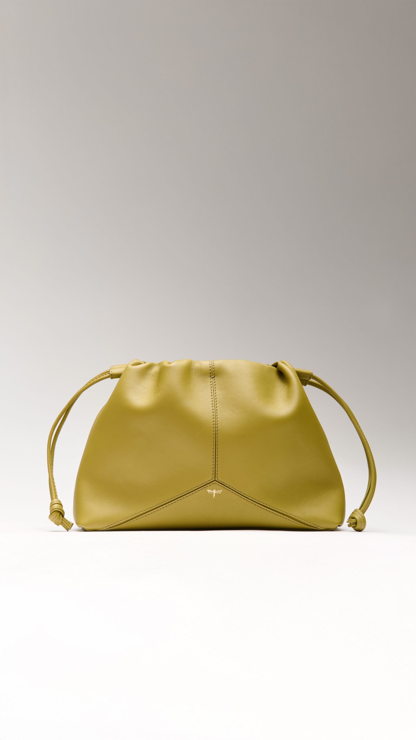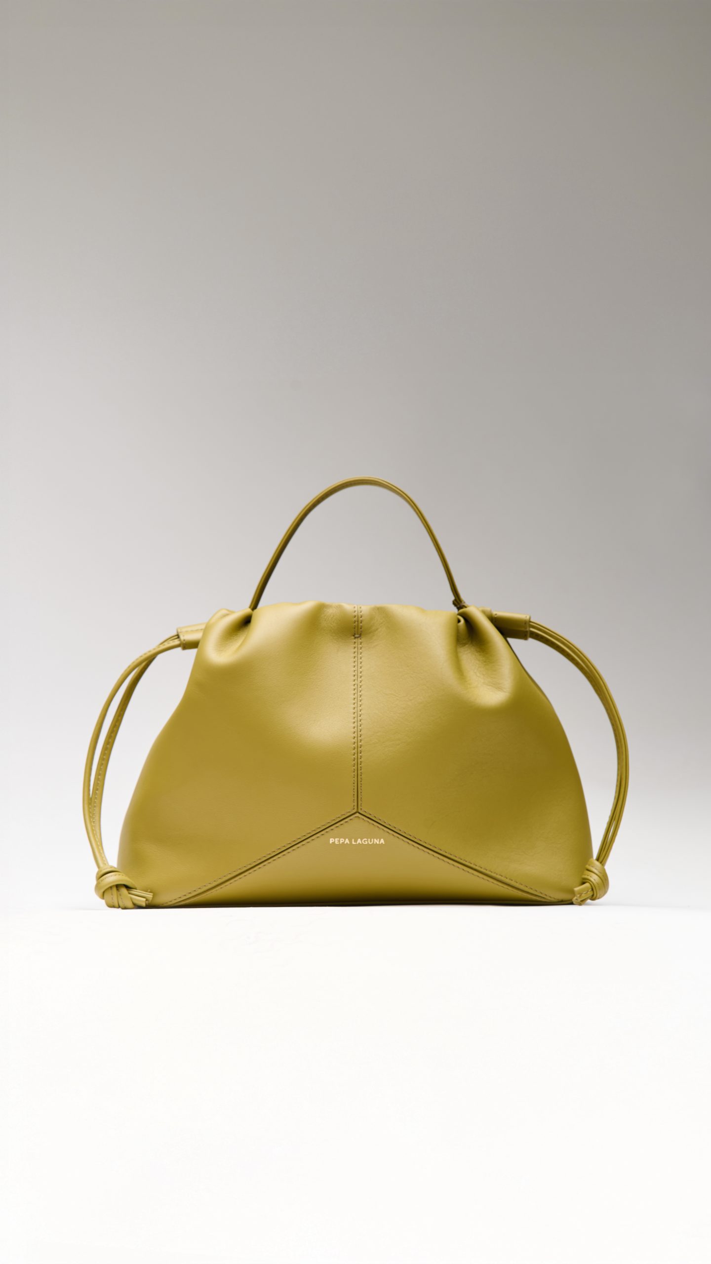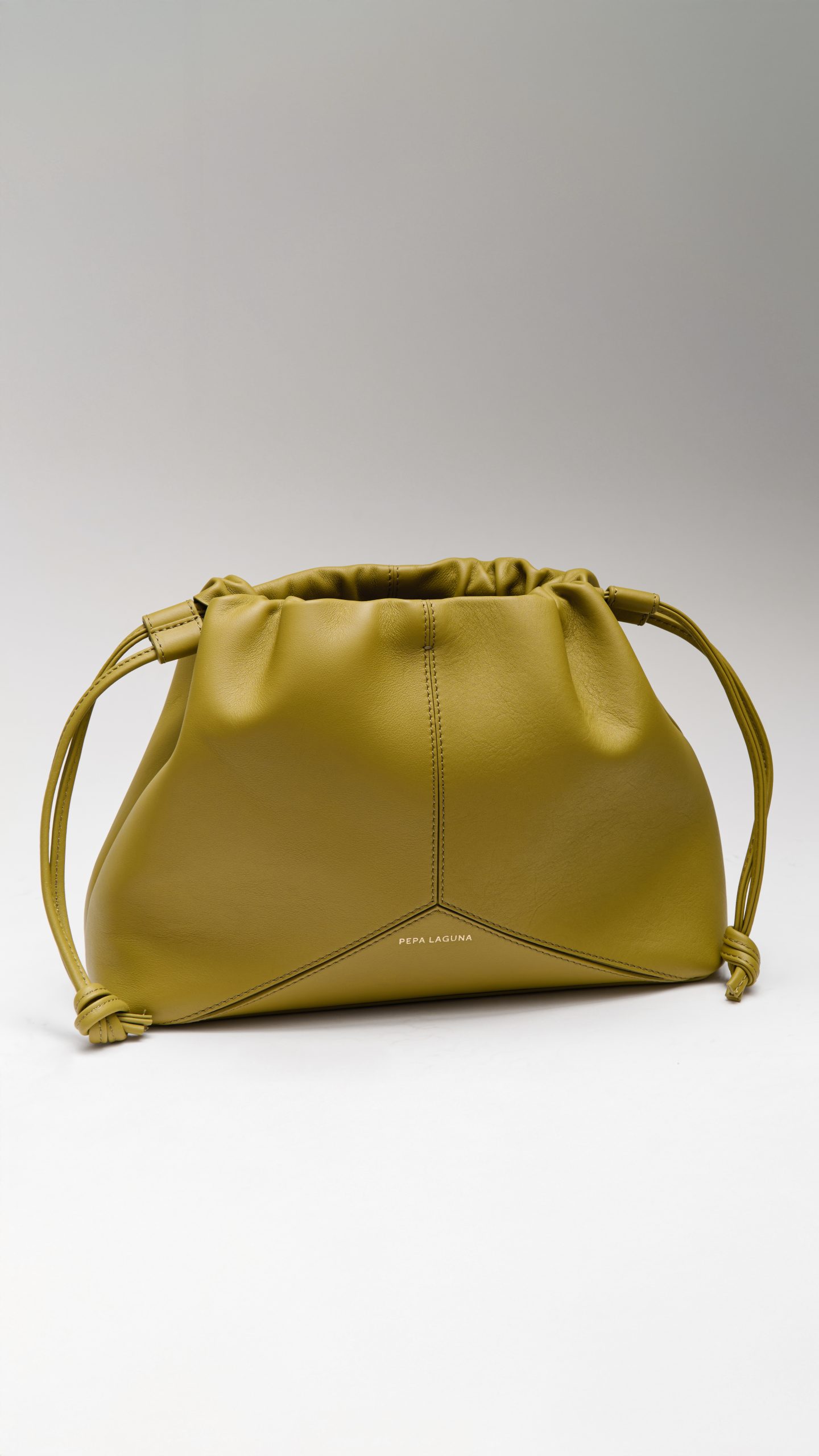 De color verde oliva, este modelo tipo saco presenta un diseño estructurado pero flexible, que se adapta cómodamente al cuerpo. Cuenta con un cierre de frunce con cordones en piel que acaban en nudos, una correa ajustable en piel, combinada con cadena metálica y un asa de mano en piel, aportando un equilibrio perfecto entre funcionalidad y estilo contemporáneo, haciendo ideal esta pieza tanto para el día a día como para ocasiones más especiales. El interior, forrado en algodón 100% en un elegante tono verde claro, incluye un práctico bolsillo plano que añade organización sin sacrificar amplitud.