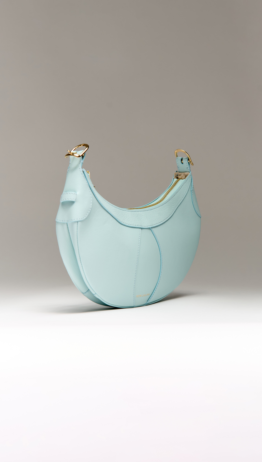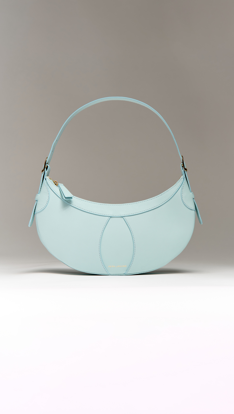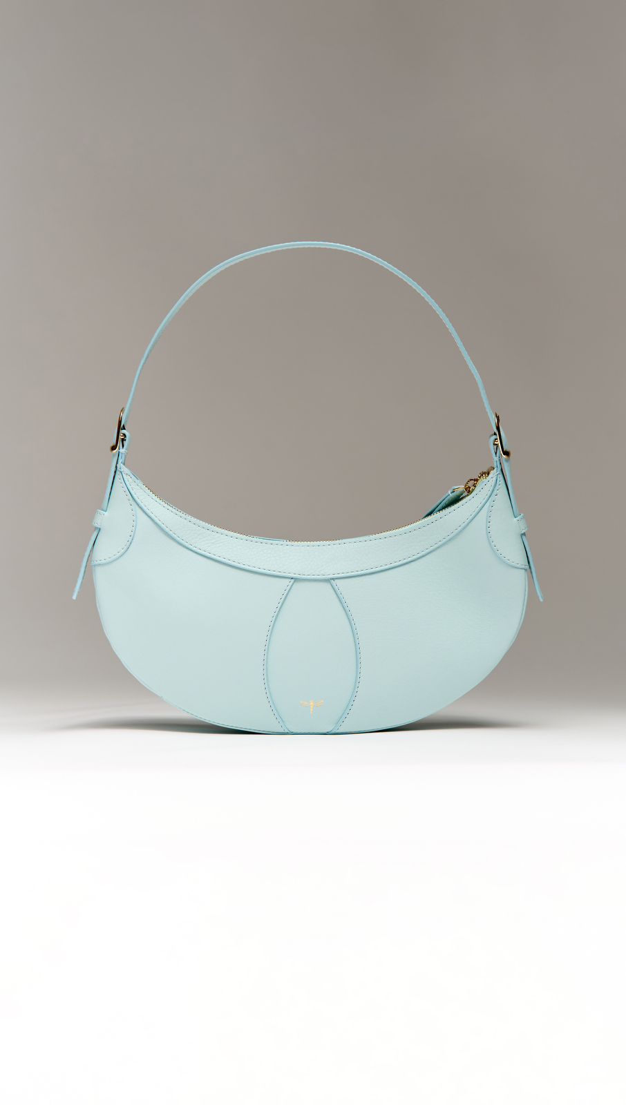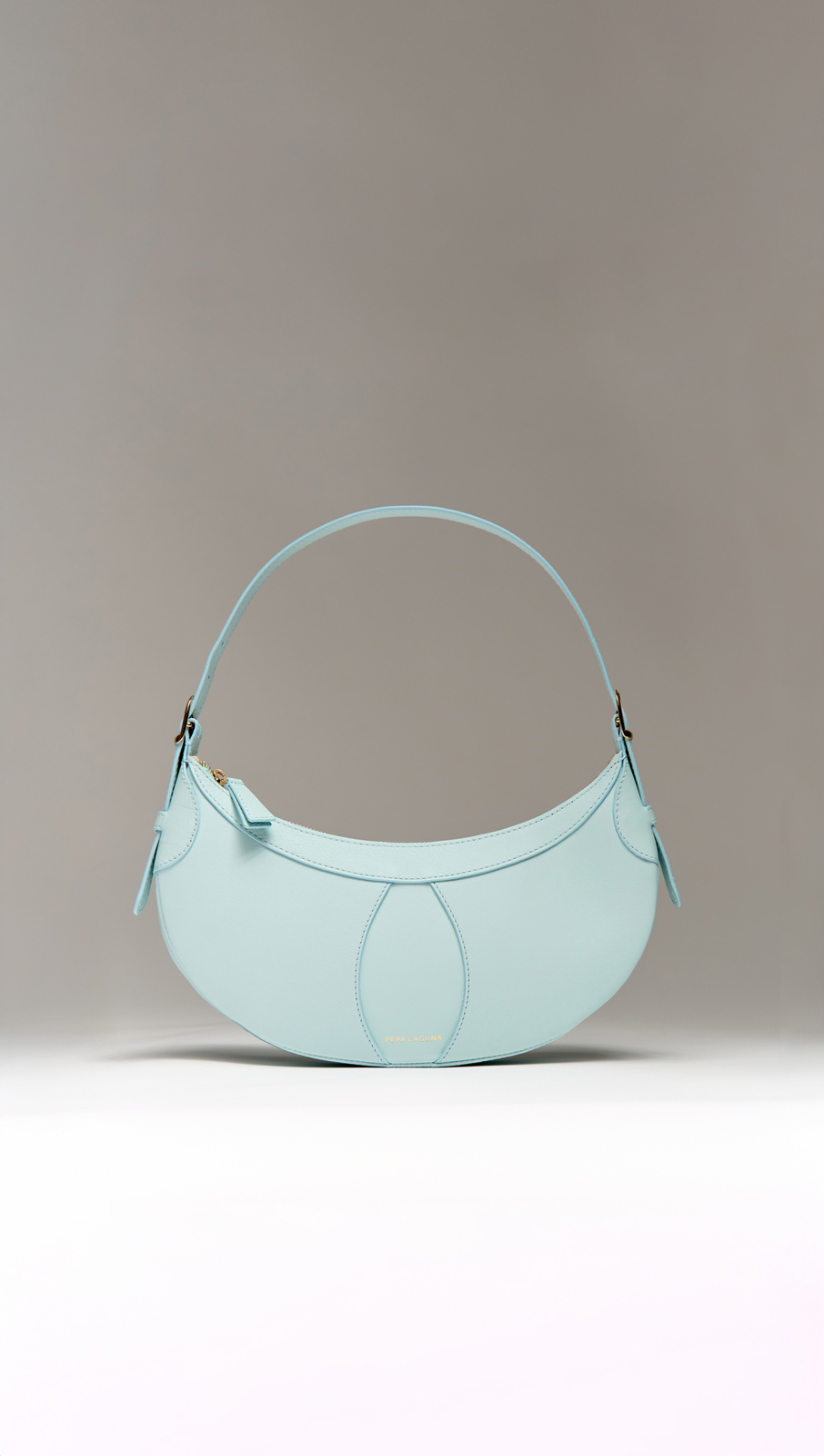 Confeccionado en piel de vacuno de la más alta calidad, su silueta curva se inspira en la libélula —símbolo de la marca— y en la serenidad lunar. Su estructura semirrígida mantiene la forma con ligereza, mientras la textura suave de la piel ofrece una experiencia táctil única.