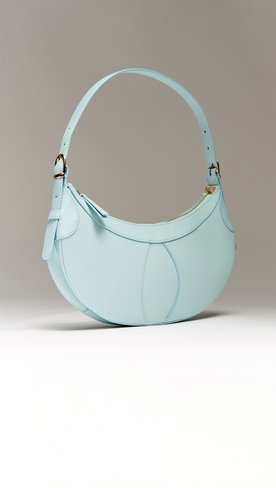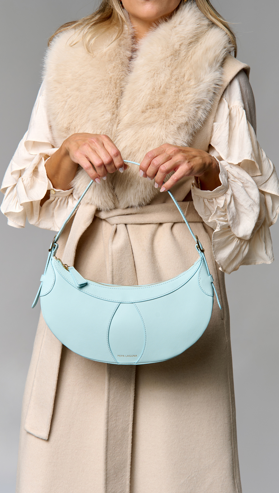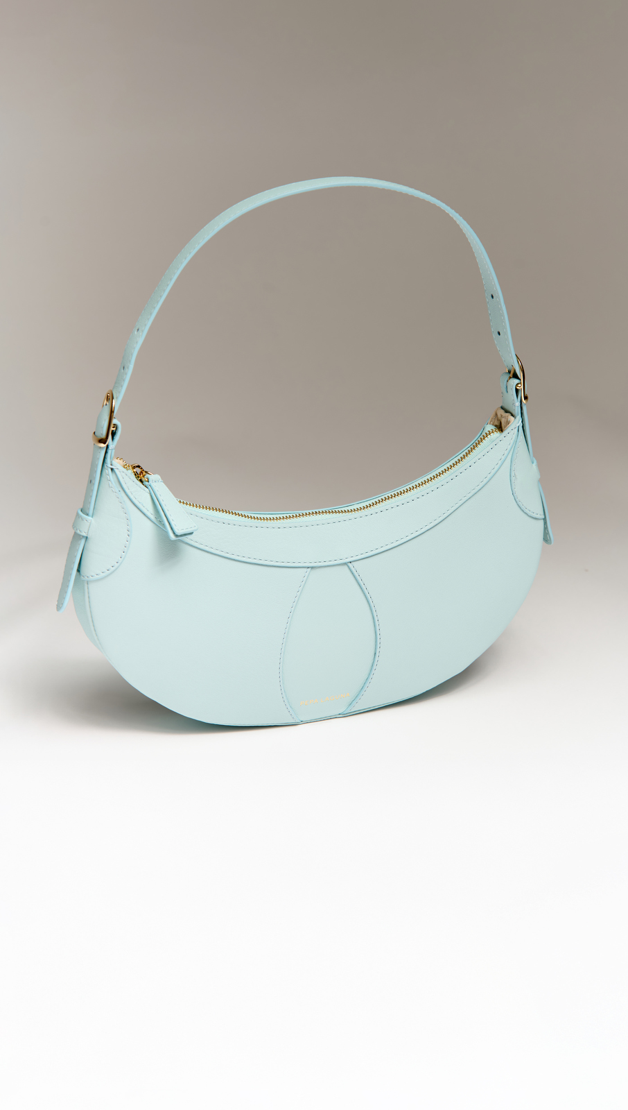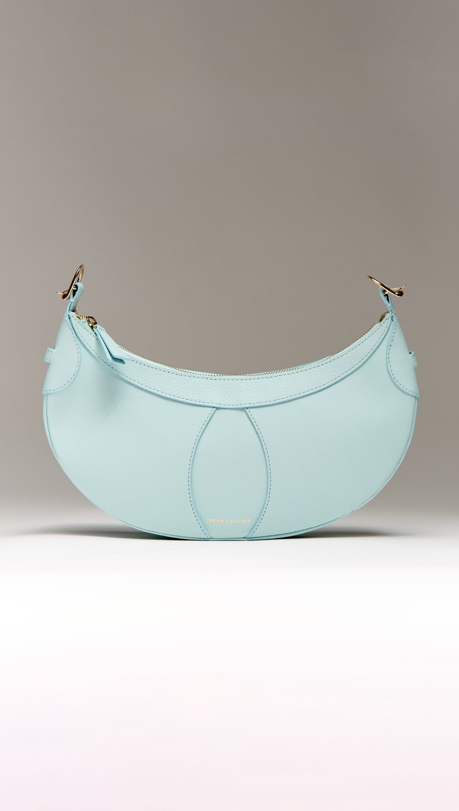 Confeccionado en piel de vacuno de la más alta calidad, su silueta curva se inspira en la libélula —símbolo de la marca— y en la serenidad lunar. Su estructura semirrígida mantiene la forma con ligereza, mientras la textura suave de la piel ofrece una experiencia táctil única.