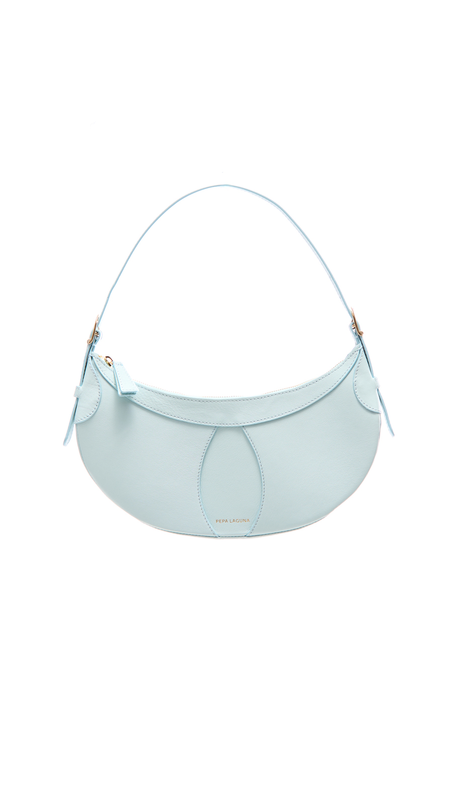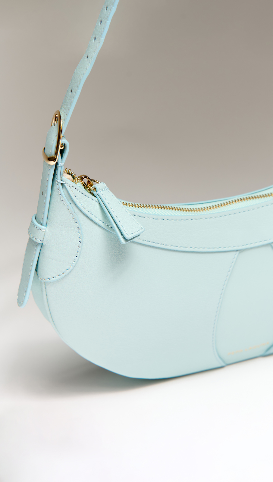 En color Celeste, su diseño semicircular y su asa ajustable lo convierten en un accesorio versátil, ideal para acompañarte en todos tus planes tanto de día como de noche. Su interior forrado en algodón 100 % incluye un bolsillo tipo sobre, pensado para una organización práctica.