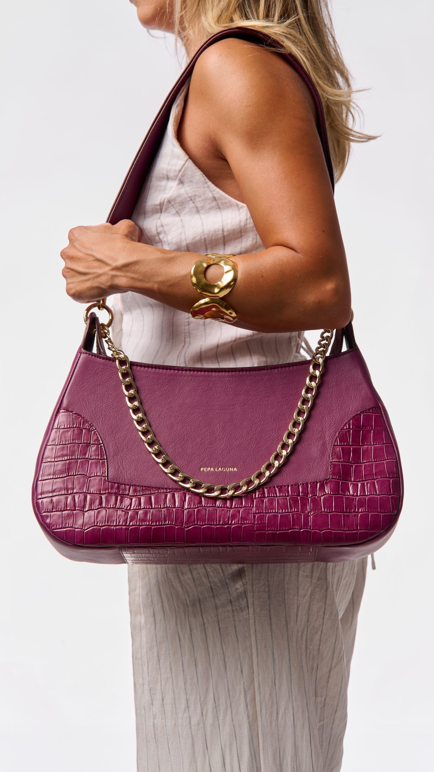 - Doble asa: una de piel y otra de cadena dorada, ambas extraíbles.