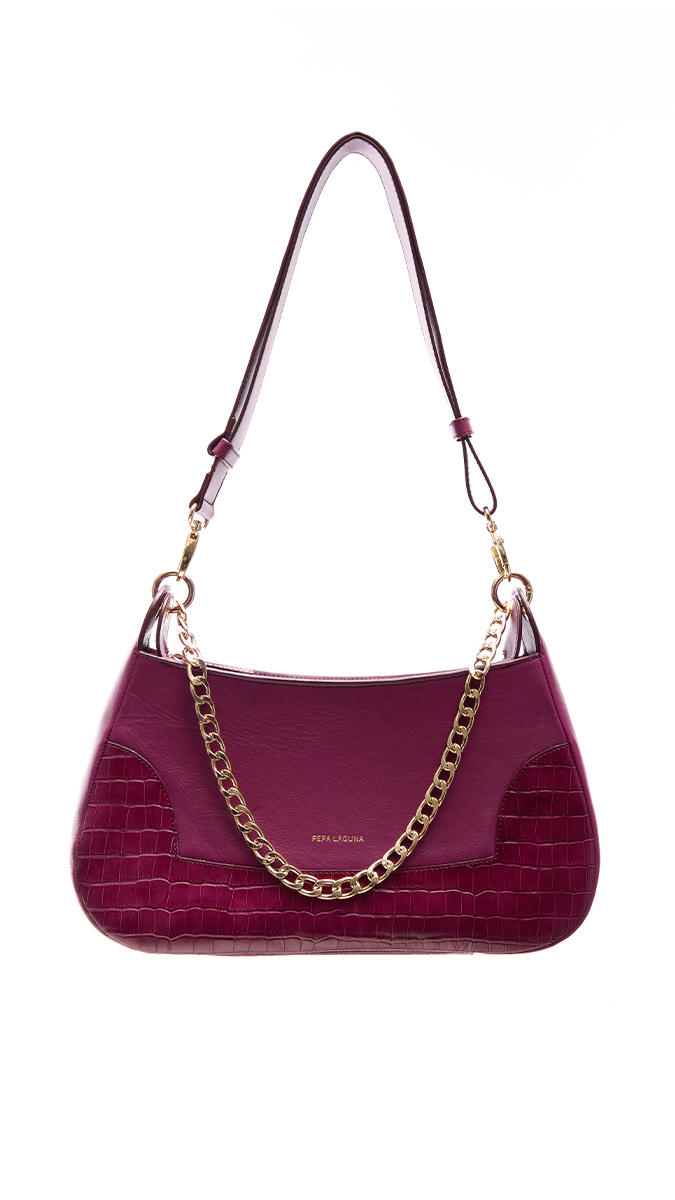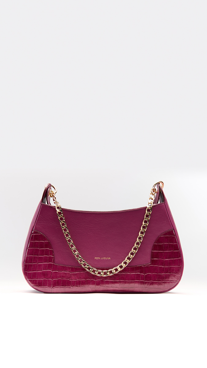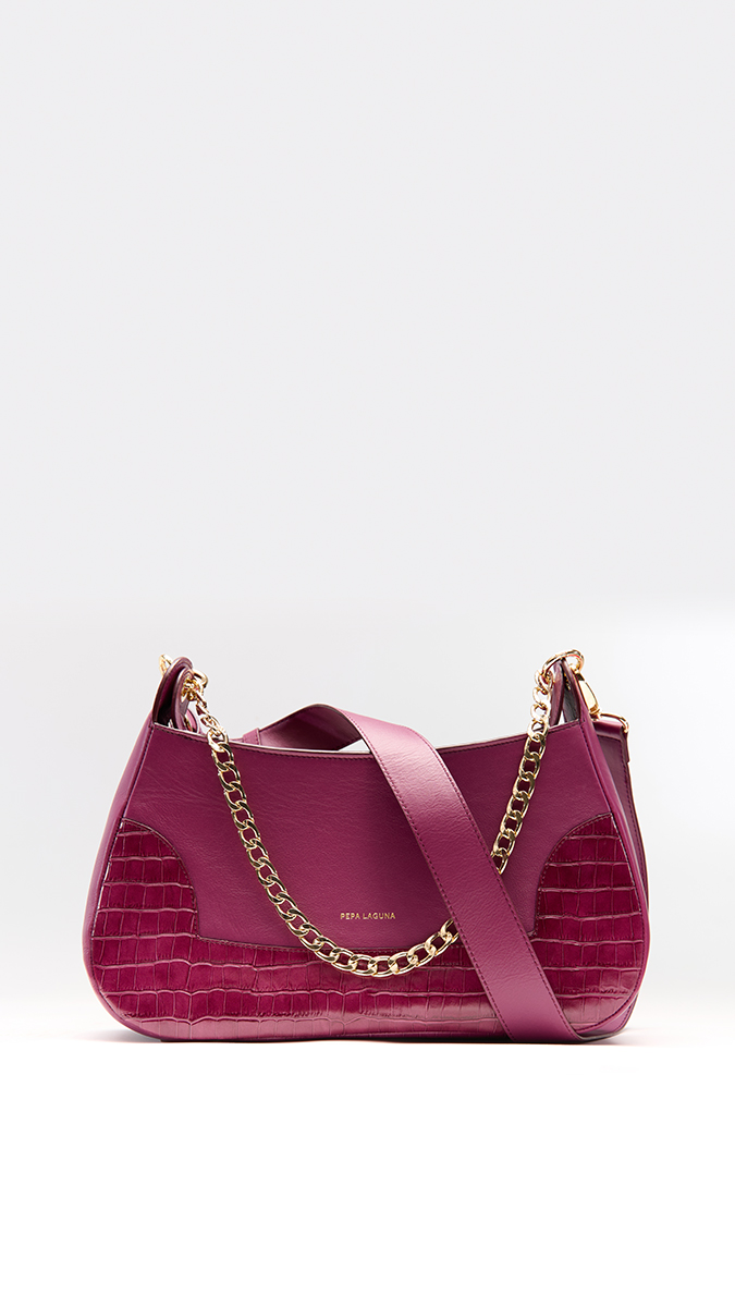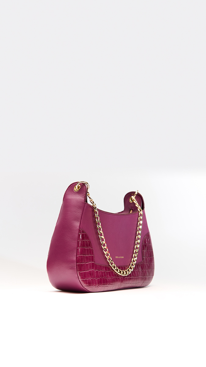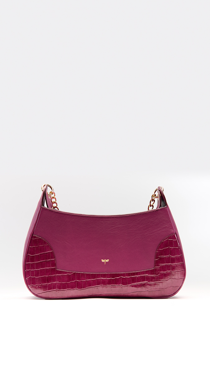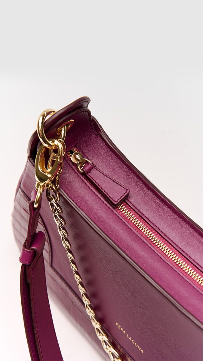 El Bolso Omega es una declaración de sofisticación contemporánea. De silueta curva y diseño estructurado, destaca por su gran presencia y elegancia. Este modelo «edición limitada» de color berenjena combina la piel de vacuno lisa con inserciones efecto coco en los laterales, aportando un juego de texturas exclusivo y llamativo. Posee gran capacidad de almacenaje y es ideal tanto para looks más sofisticados como para el día a día.
