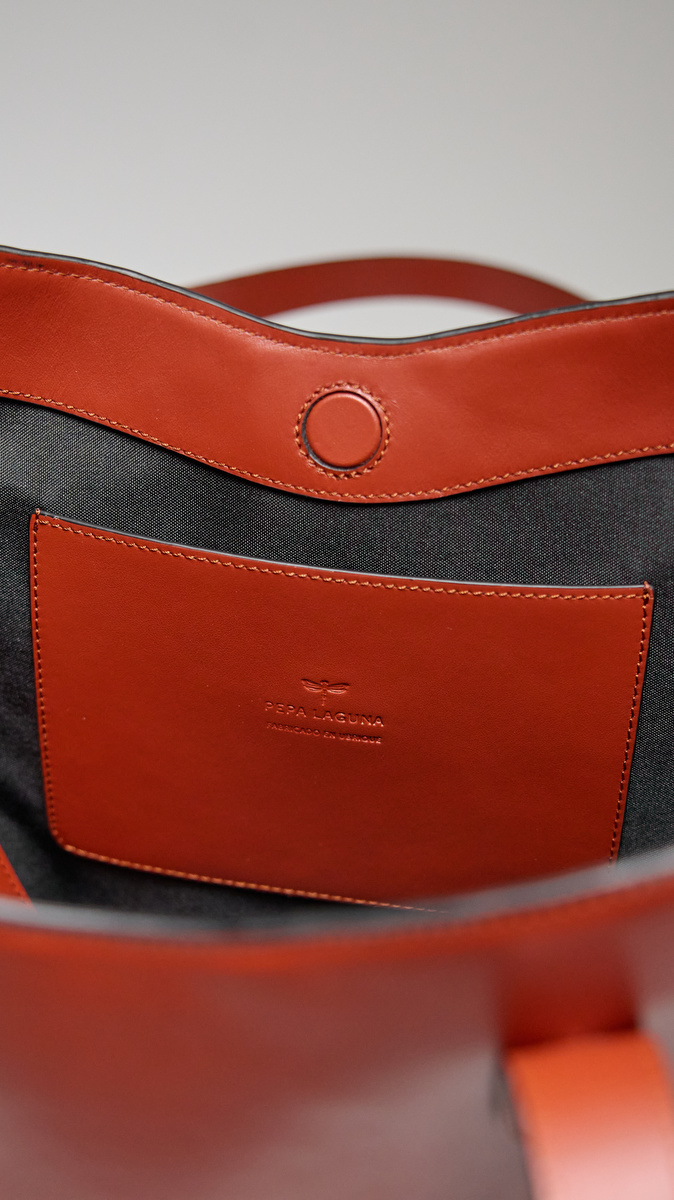 El diseño se completa con un cierre de imán invisible que aporta seguridad y un sutil detalle frontal en piel que añade carácter sin romper la armonía del conjunto. El interior, forrado en algodón 100 %, ofrece un espacio generoso y funcional, e incluye un bolsillo interior lateral en piel y un mini neceser, ideal para mantener organizados los imprescindibles con elegancia y comodidad.